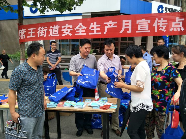 活动现场,席王街道办悬挂了宣传横幅、设置了安全知识展板和安全生产法律法规咨询台,免费发放印有安全知识的宣传扇、环保购物袋以及安全知识手册等贴近群众生活、通俗易懂的安全生产纪念品。此次共展出宣传展板6块,发放安全生产法规和宣传图册、宣传单2000余份、购物袋2000个、塑料扇子1000个、抽纸1000盒,为"安全生产月"活动的深入开展,营造了浓厚的宣传氛围。